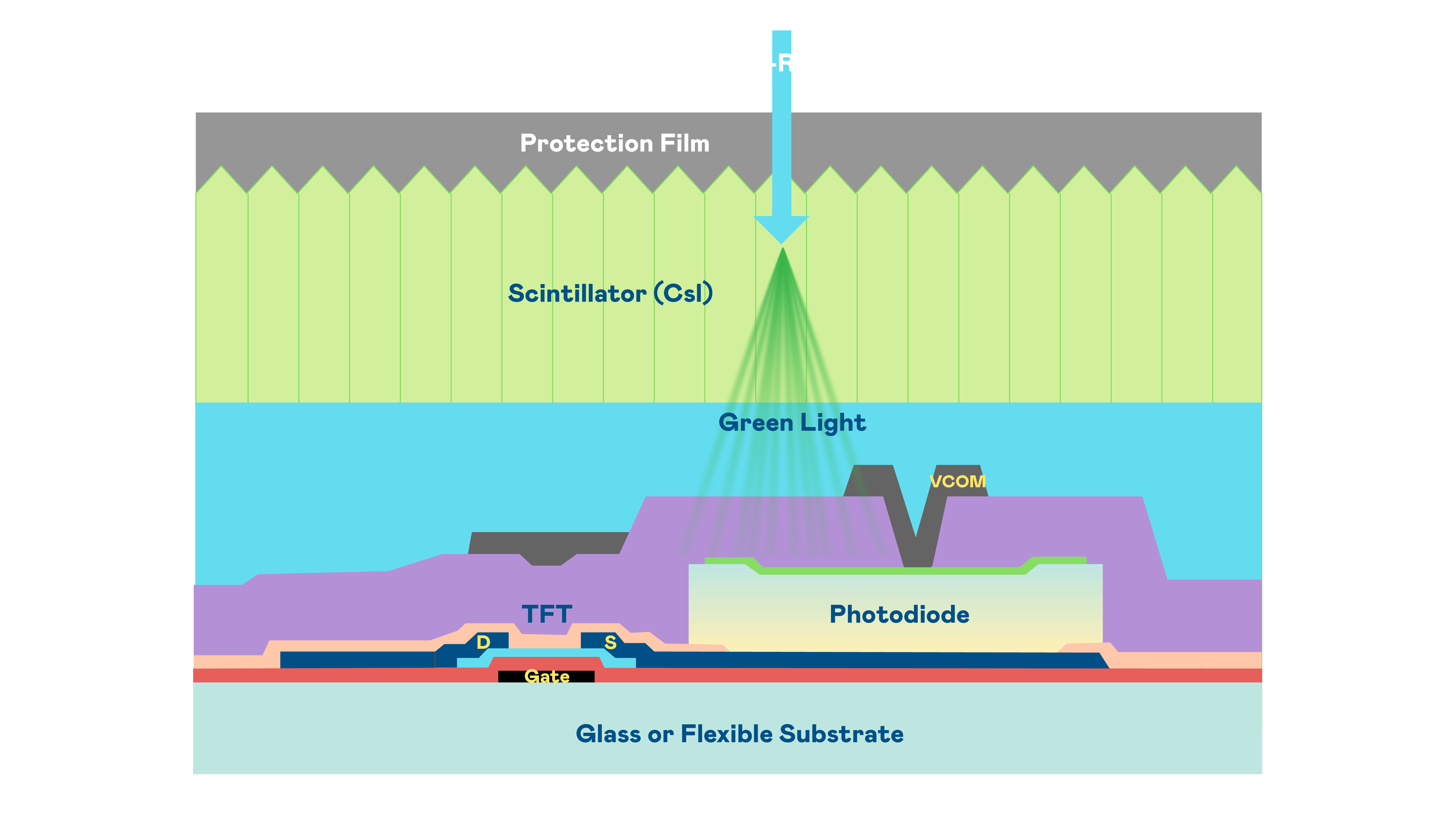 PG国际的X光影像感测阵列使用薄膜电晶体 (TFT) 作为每个像素的读取开关,搭配光电二极体(Photodiode)的光电转换元件,用以感测X光影像讯号。